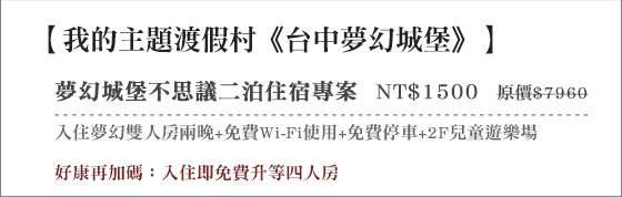 商品訊息簡述: 只要1500元(二~奶H價,含運)即可享【我的主題渡假村《台中夢幻城堡》】原價7960元夢幻城堡不思議二泊住宿專案:入住夢幻雙人房兩晚+免費Wi-Fi使用+免費停車+2F兒童遊樂場,好康再加碼:入住即免費升等奶H房!